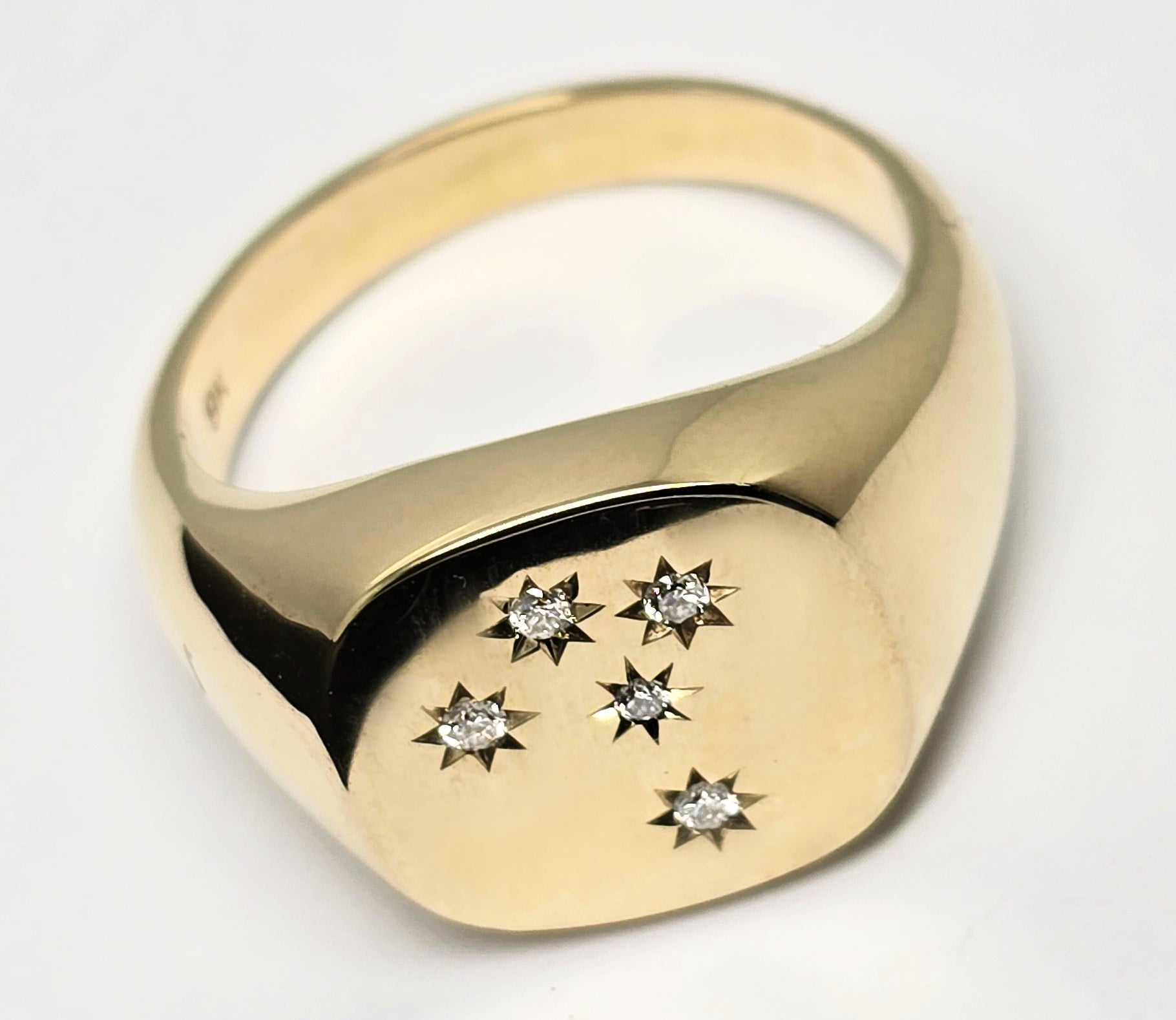 9ct Yellow Gold 13mm Cushion shape flat top signet ring with Diamonods set in shape of Southern Cross. Hollow