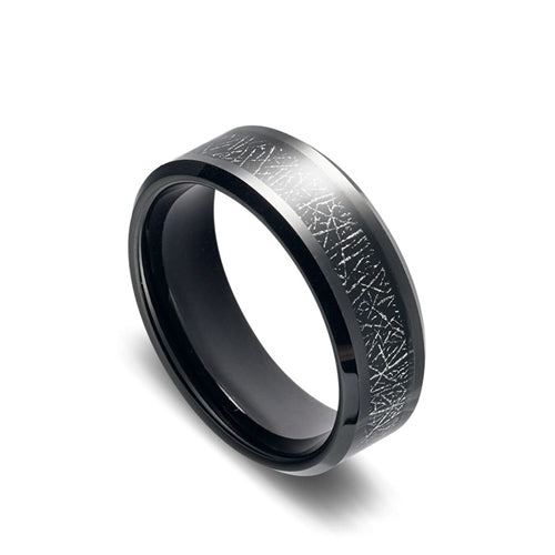 Blaze Tungsten men’s IP black plated ring with simulated meteorite inlay.